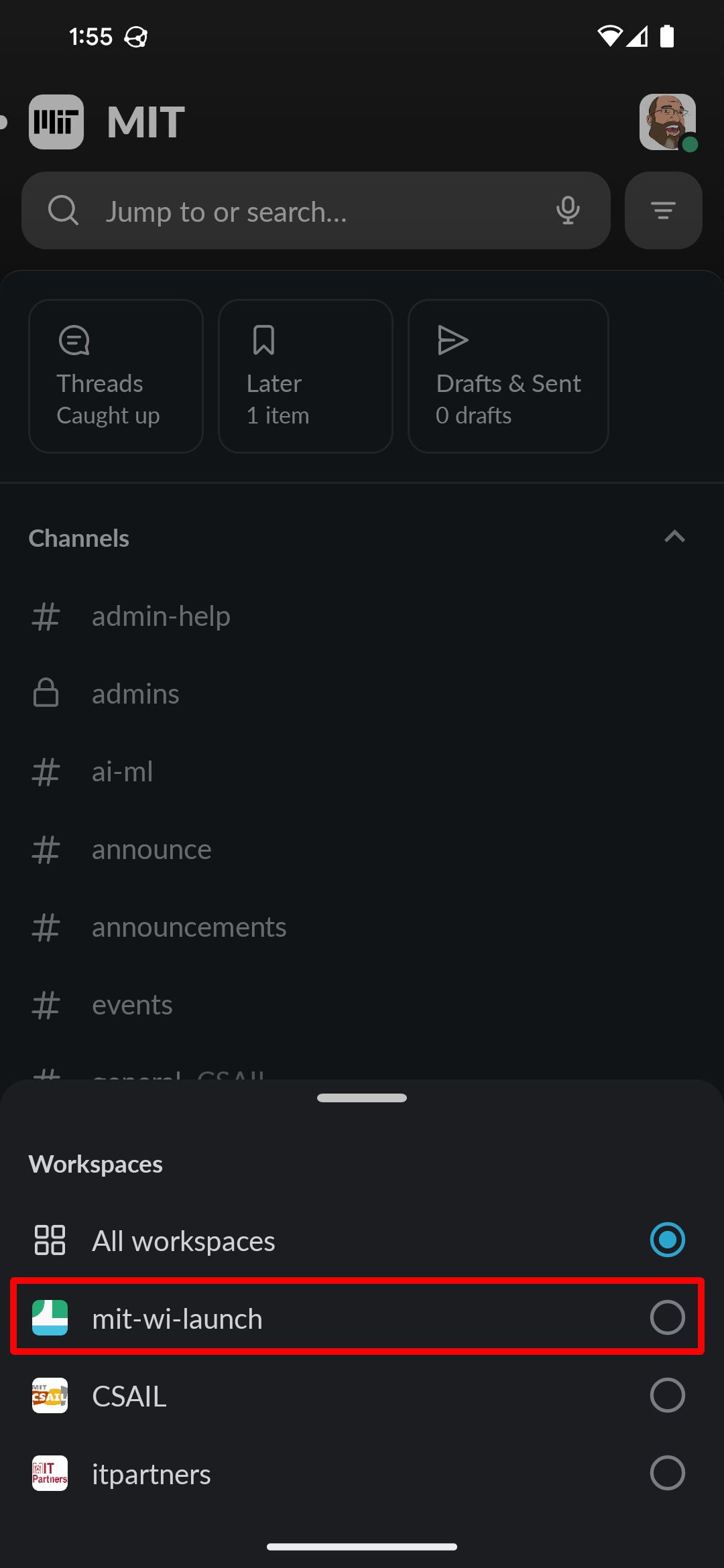 When you’re in the slack app it will appear that you’re in a general MIT slack, and you are. The WI Launch slack is a workspace within that larger Slack Enterprise-Grid.