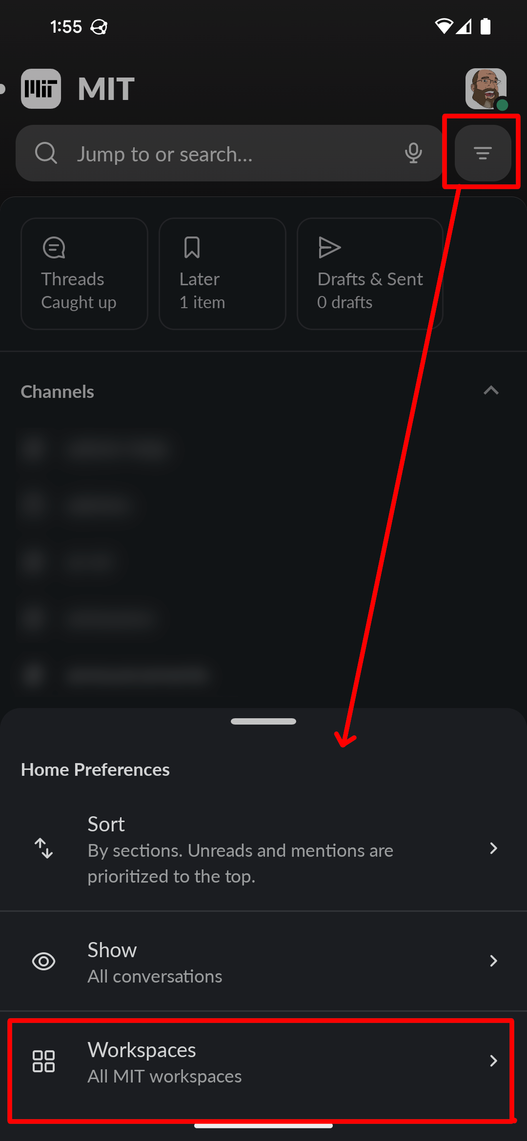 By default, all the channels from all the mit workspaces you belong to will be displayed all together.
